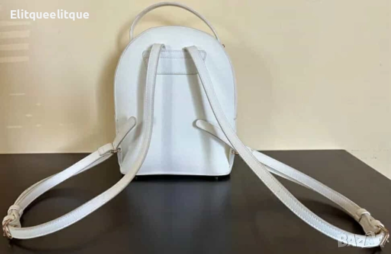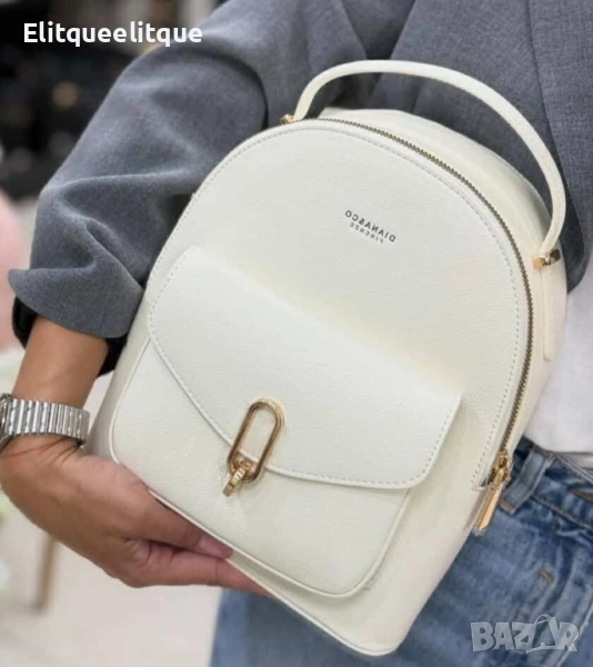 Тип продукт: Дамска раница; Diana & Co предлага елегантна дамска раница с изчистен и модерен дизайн, която съчетава функционалност и стил. Подходяща както за ежедневието, така и за пътувания, тя придава завършеност на всяка визия – от градски шик до по-непринудена спортно-елегантна комбинация. – Материал: висококачествена еко кожа (PU); – Размери: приблизително 26 см (височина) x 22 см (ширина) x 12 см (дълбочина); – Джобове: 1 основно отделение с цип, 1 външен джоб с капак, вътрешни отделения за организация; – Подплата: текстилна с фин десен; – Затваряне: цип и капак с декоративна метална катарама; – Регулируеми презрамки; - Цвят: Бял , черен; – Метални крачета в долната част за защита при поставяне.