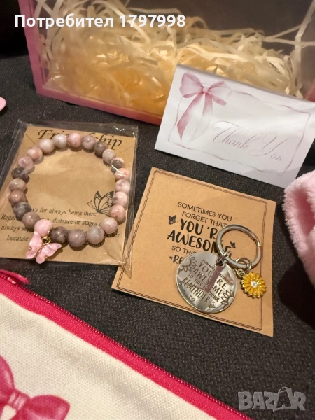 Нов подаръчен комплект идеален да зарадвате приятелка или роднина .Включва подаръчна чанта,лента за коса ,ключодържател,гривна,химикал,скрънчи,несесер и книга разделител и картичка .Нещата са нови