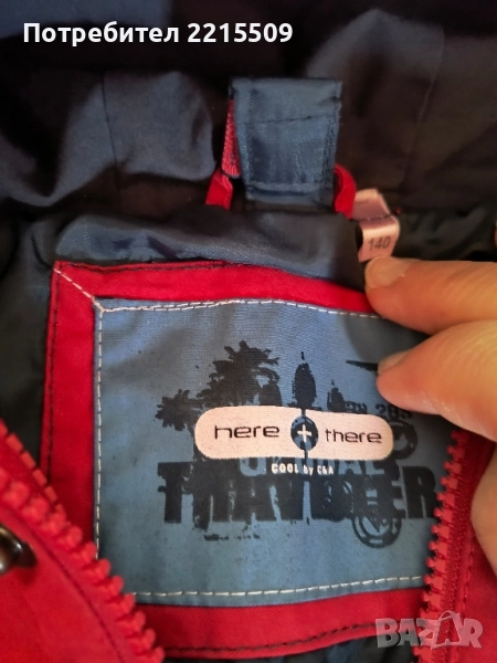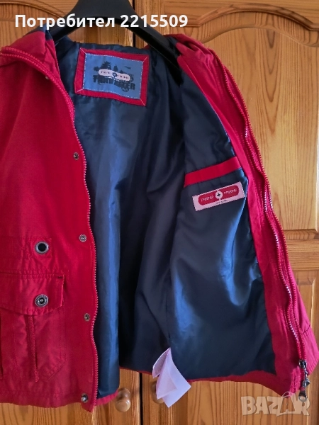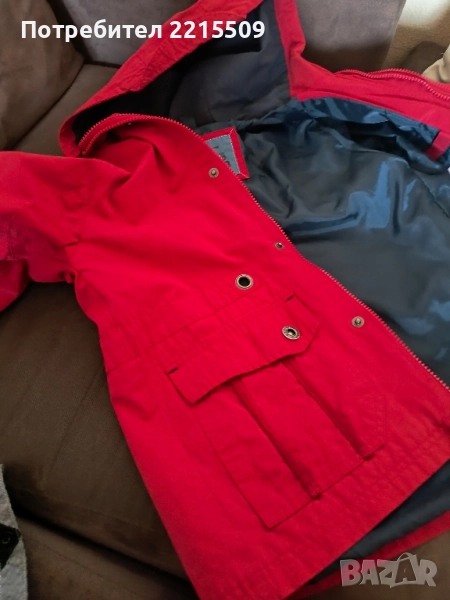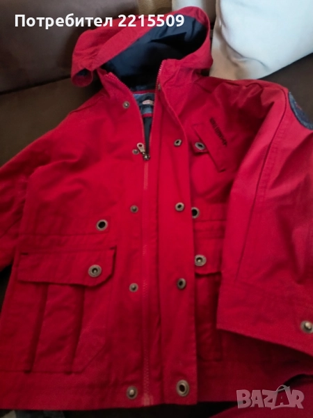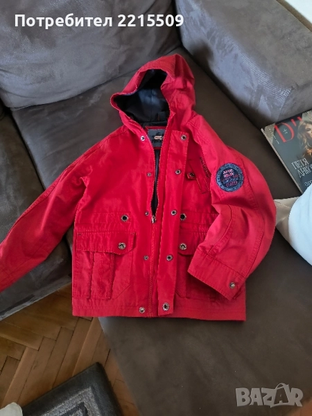 Чудесно яке за момче, купувано от Англия. Материята е плат( като канадките),с подплата. Почти ново. Качулката е с козирка, не се сваля. Удобно и за дъжд, и за вятър. Подарък- шапка.Цветът е червен, не е избелял.