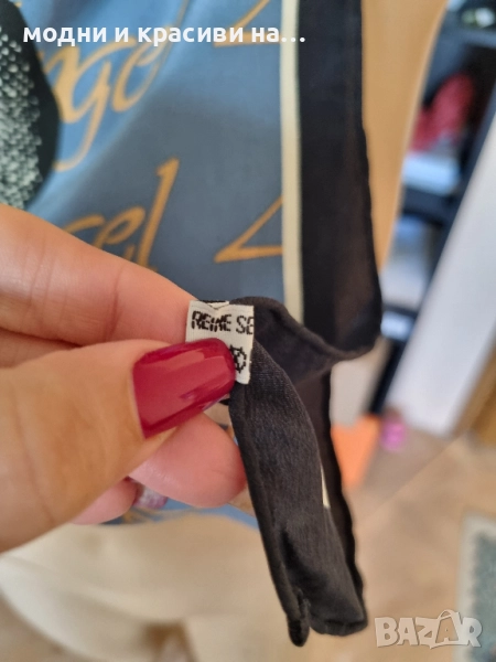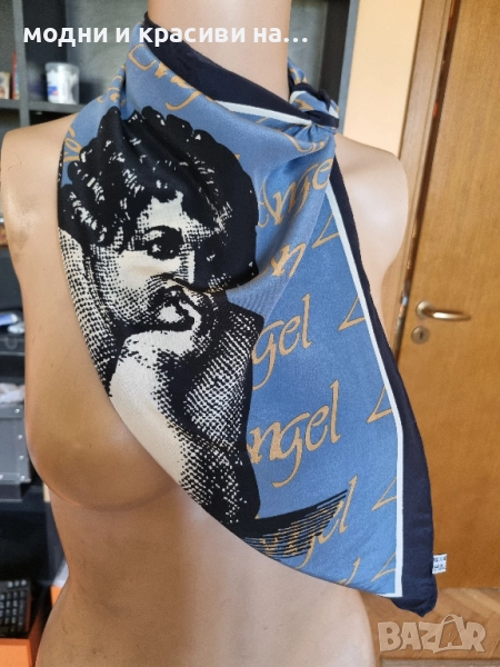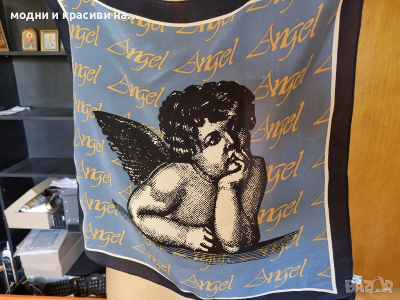 Копринен шал с много ефектен и оригинален десен на Ангел.Основната тоналност е светлосиня с тъмносин кант по краищата на целия шал за контраст. Жълти надписи "angel".