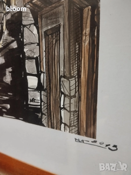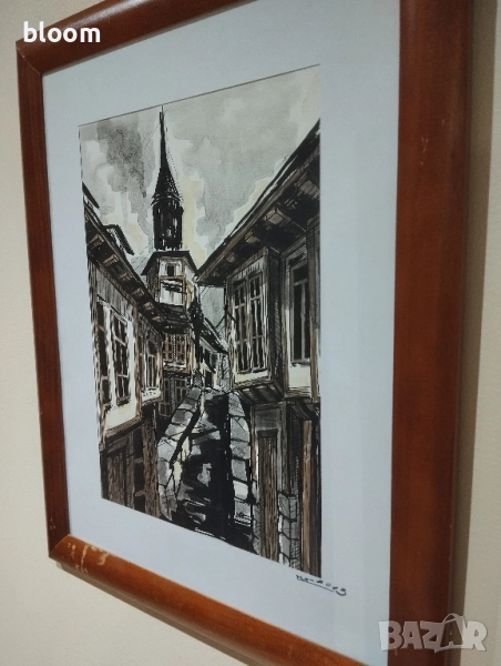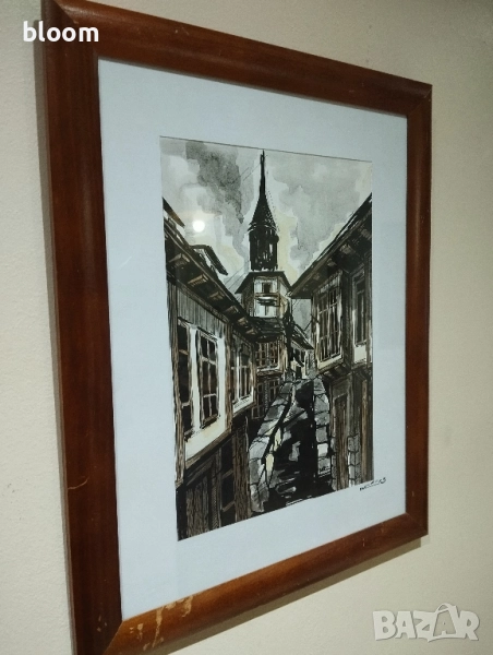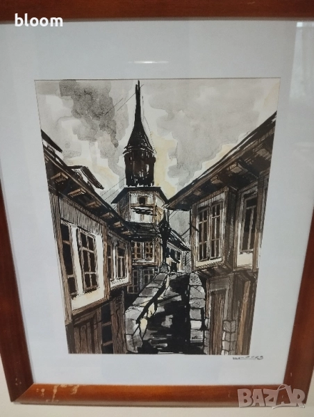 Картина рисувана с туш и акварел,подписана.Дървена рамка със стъкло.Размер 41 см на 33см заедно с рамката.