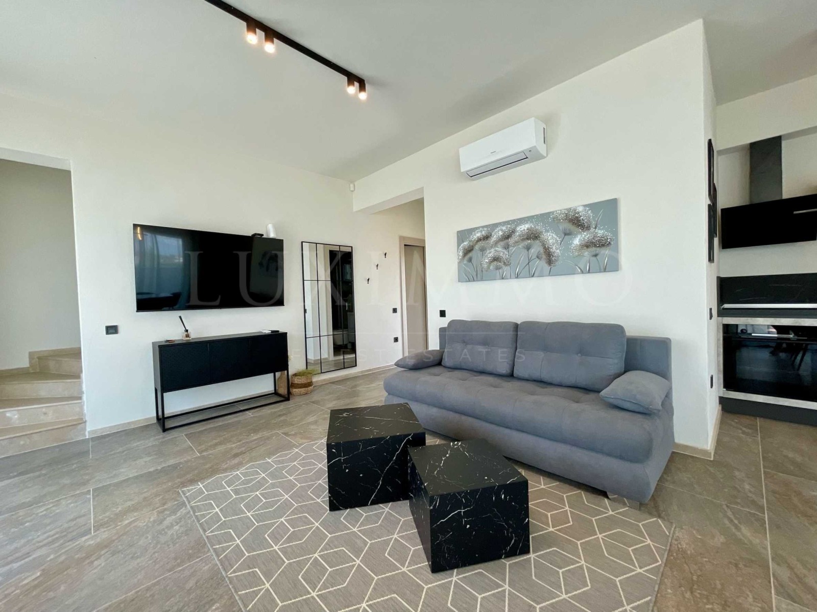 На ниво партер е всекидневната с кухня, маса за хранене и мека мебел с обща площ 38 кв.м. Всички мебели са внос от Италия, а уредите са Bosch: вграден хладилник, вградена съдомиялна, аспиратор, индукционни котлони четворка, фурна и домакин ел. уреди. Входното антре дели пространството между банята с тоалетната и склада под стълбите, в който са поставени два бойлера, осигуряващи топлата вода в къщата.