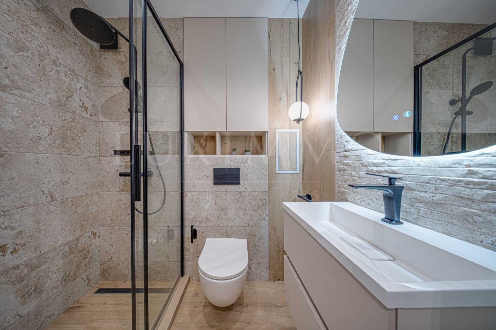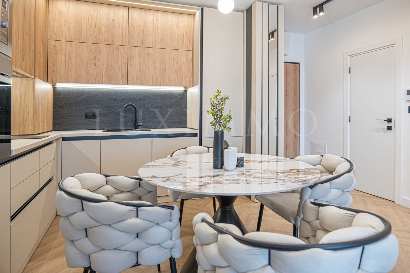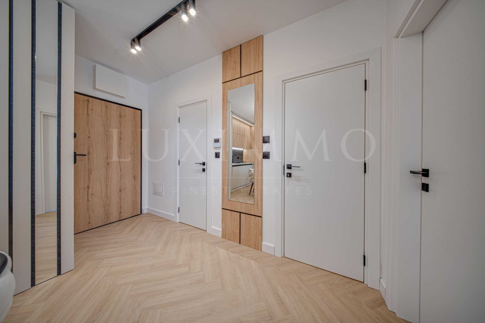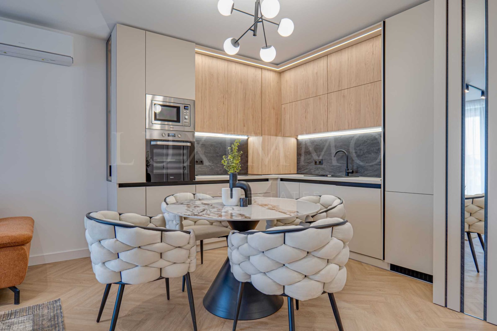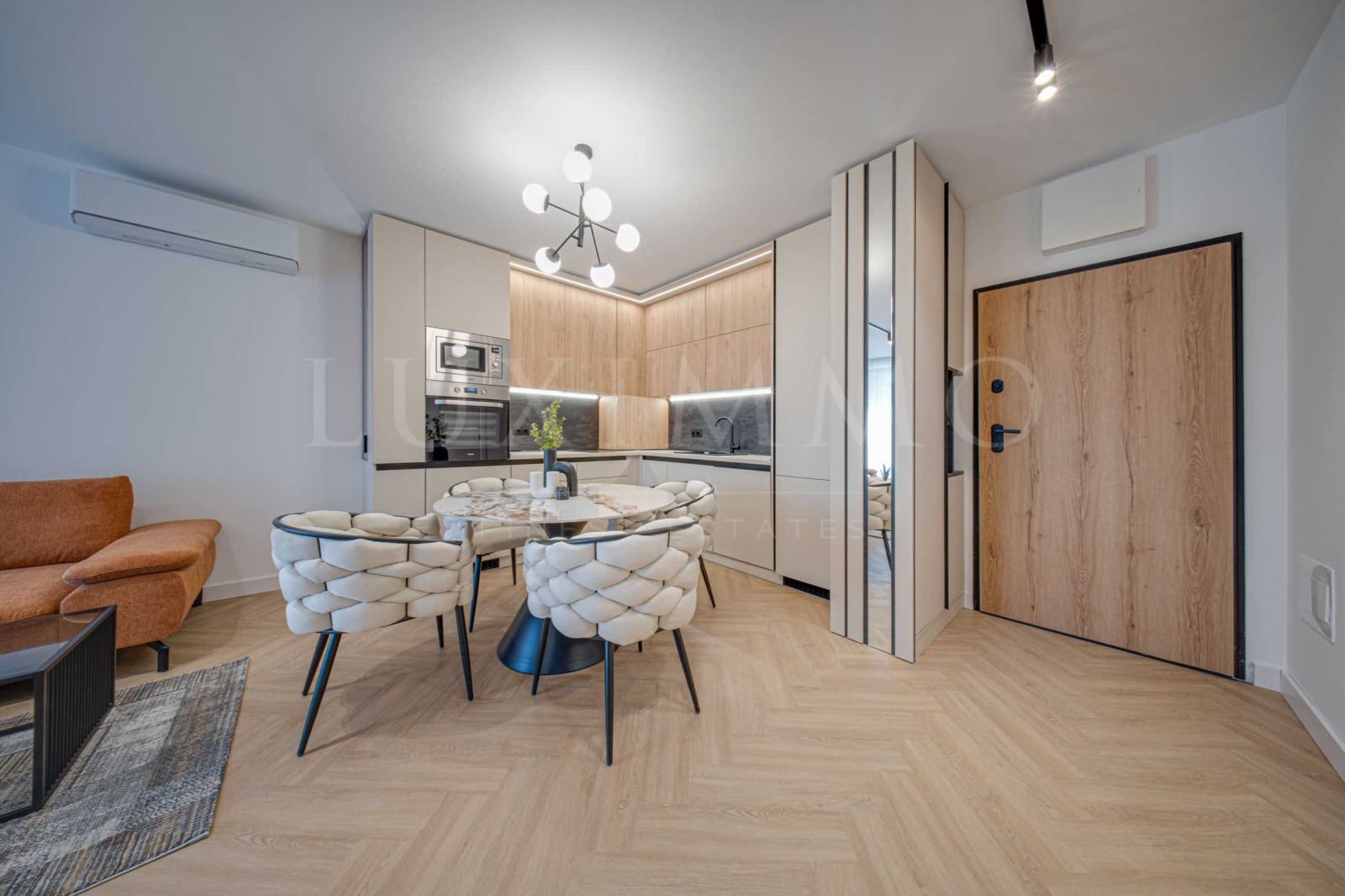 Представяме модерен двустаен апартамент по дизайнерски проект в сграда OKINAWA Boutique Residence. Възможно е закупуването на подземно паркомясто с контакт за зареждане на ел. автомобил на допълнителна цена от 27 000 евро без ДДС. В цената е включено мазе с площ 3.40м2. Сградата е с Разрешение за ползване (Акт 16) от 2025г. и разполага с луксозни общи части от мрамор, два асансьора Schindler, контрол на достъп, външен street фитнес и озеленен двор. Отоплението е подово на газ с котел Viessman, а охлаждането е решено чрез климатична сплит-система Gree. Сградата е с енергиен сертификат клас А и е изпълнена с окачена фасада Laminam, френски прозорци, алуминиева дограма с троен стъклопакет и топли дистанционери, с топло- и шумоизолация от каменна вата на външни стени и между жилищата тип сандвич (тухла-вата-тухла), варова дишаща мазилка в апартаментите и италиански блиндирани входни врати Dierre. РЗП на имота: 76.54 кв.м. Жилището е разположено на 5-и жилищен етаж от 8 за сградата. Върху застроена площ от 57.85м2 са разпределени: дневна с кухня и трапезария, спалня, обща за двете стаи тераса, баня и мокро помещение. Настилка - водоустойчива винилова SPC клас 34; стени - варова шпакловка и дишащ латекс; баня испански гранитогрес от Roca и Porcelanite Dos, 1-во качество; структури за вграждане Roca, шкафове Roca и по поръчка от МДФ; кухня по поръчка и облицовки стени от МДФ - Egger с обкови Blum; всички вградени електроуреди