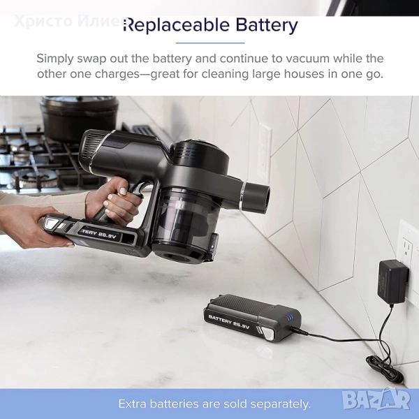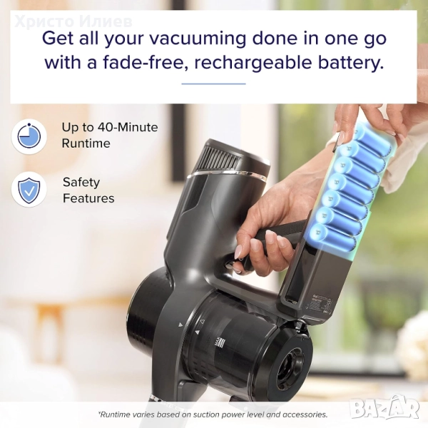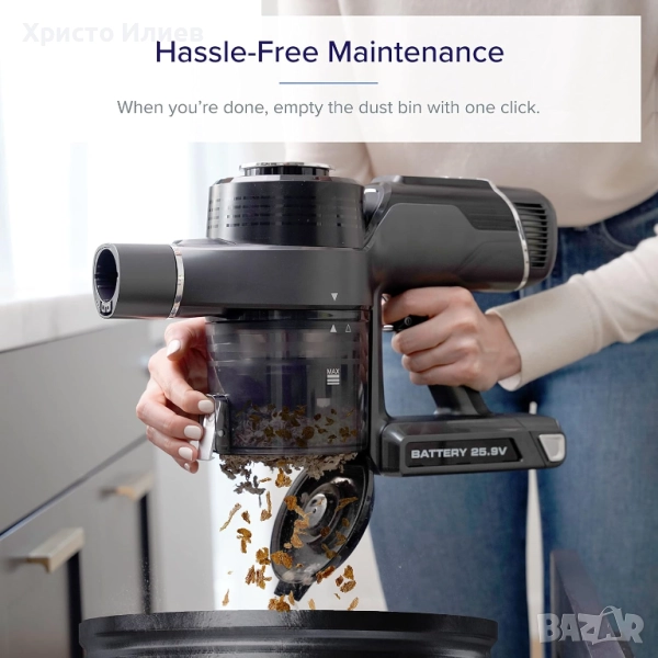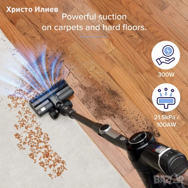 Дълбоко почистване на всички подови настилки: С безчетков мотор със 100 000 оборота в минута и технология VortexAir, тази безжична прахосмукачка генерира всмукателна мощност от 21,5 Kpa. Ефективно премахва прах, боклуци и големи отпадъци от килими и твърди подови настилки, вместо да ги избутва напред.