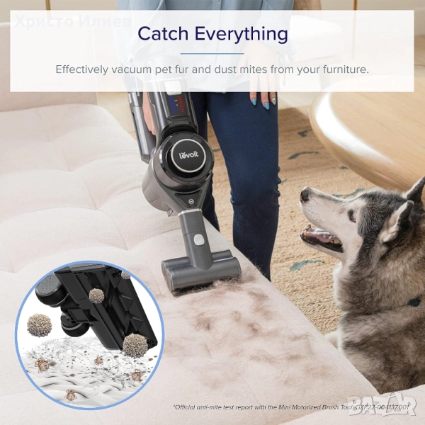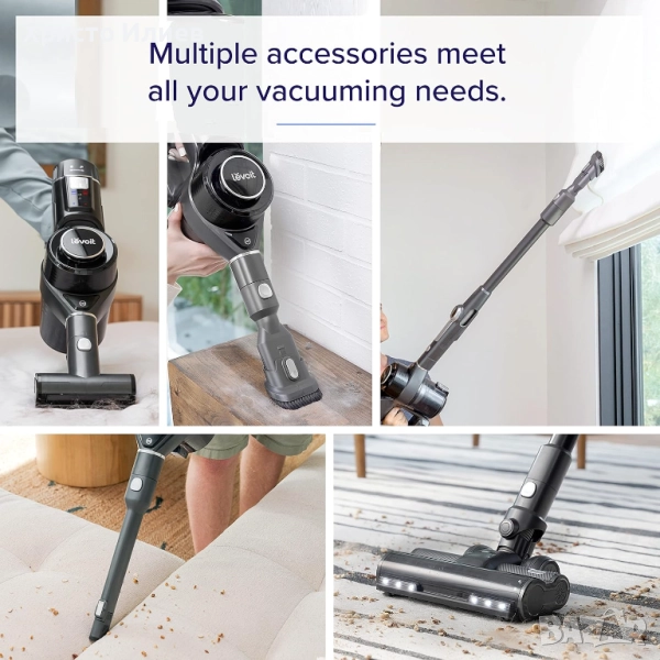- Гъвкав дизайн: Тази прахосмукачка е с ергономичен дизайн, който ви позволява лесно да почиствате долните ъгли, като например шкафове и мебели. Прахосмукачката LEVOIT има уникален дизайн с катарама, който ви позволява лесно да превключвате между множество аксесоари (телескопичен накрайник за цепнатини, четка за прах 2 в 1, мини моторизирана четка и др.) с леко натискане.
