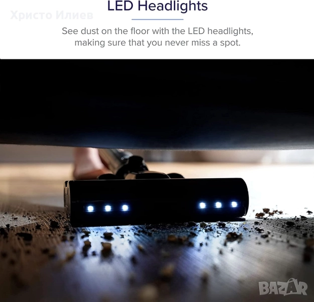 - LED фарове и контролен панел: Шест ярки LED светлини са проектирани пред главата на четката, за да осветяват всеки ъгъл, така че да можете да виждате прах и отломки и да улесняват почистването. Големият контролен панел показва нивото на батерията, всмукателната мощност, предупреждение за заседнала четка и предупреждение за запушване на всмукателната система.