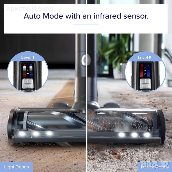 - Интелигентен автоматичен режим: Технологията за динамичен контрол на мощността (DPC) на тази безжична прахосмукачка автоматично регулира всмукателната мощност въз основа на нивото на замърсявания, засечено от инфрачервения сензор, елиминирайки догадките и оптимизирайки живота на батерията и времето за работа.