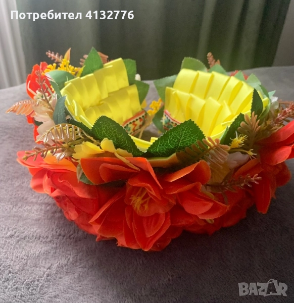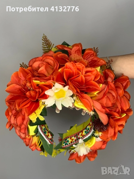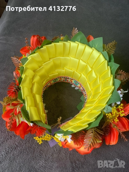 Диадемата "Златна есен“ е ръчно изработена. Големи, красиви цветя и ярки сатенени панделки придават на венеца изключителна красота и богатството на родната земя. Тази диадема е прекрасен подарък. Универсален размер. Цена: 55 лева.