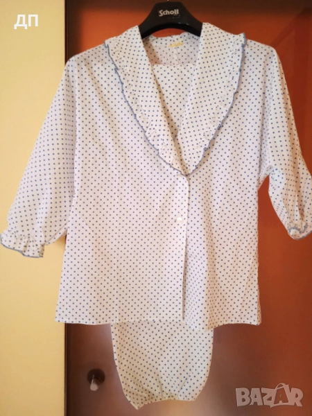 НОВА ПИЖАМА ОТ СОЦ.ВРЕМЕНАТА НА ЗАВОД РОДИНА ГР. ПОПОВО. ПАМУК, БЯЛА НА СИНИ ТОЧКИ. РАЗМЕР L , може и XL. ЦЕНА 25 лв. ИЗПРАЩАНЕ С ЕКОНТ ИЛИ СПИДИ С ПЕГЛЕД И ТЕСТ.