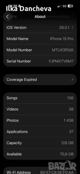 Продавам iPhone 15 Pro. Цвят Natural Titanium. В идеално състояние. Капацитет на батерията 91 %.