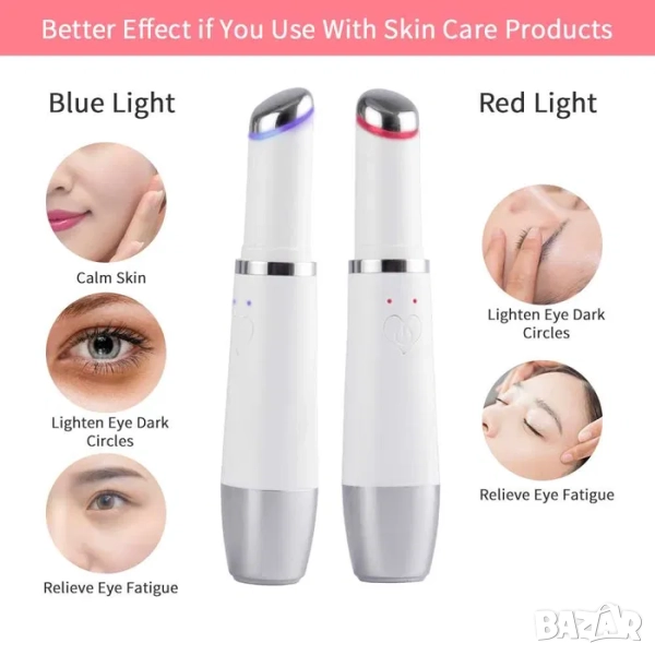 Червена светлина : помага за борба с бръчките около очите и подобрява производството на колаген. Прави кожата около очите нежна.