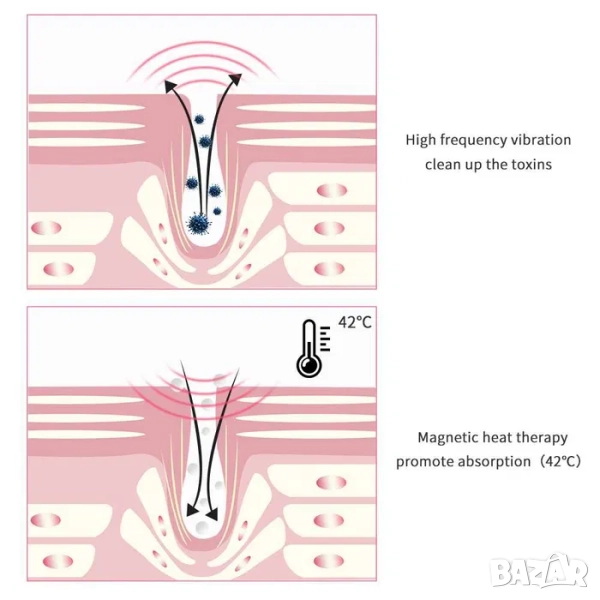 3. След което масажната глава се докосва до кожата на очите и се движи бавно за няколко минути - не повече от 5 минути на око. Може да се използва всеки ден по веднъж на ден или през ден.