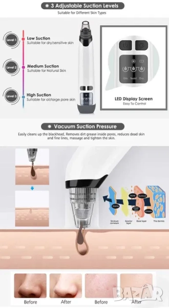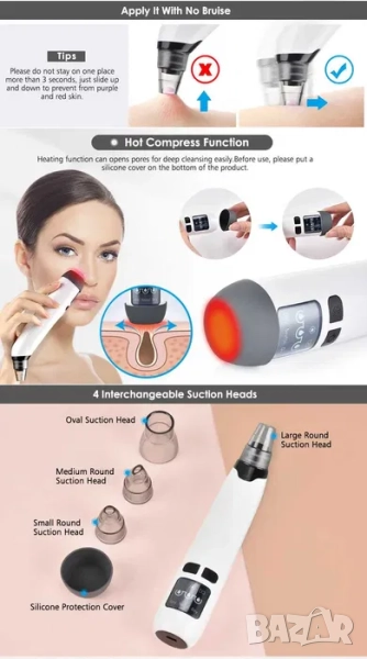 Иновативно дълбоко почистване на черни точки по лицето с вакуум уред вкъщи. Лесно и бързо, красива кожа за минути. Отворете порите с горещ компрес, технология, която е вградена в уреда, почистете всички примеси от порите си и дайде на кожата си нова свежест и здраве.