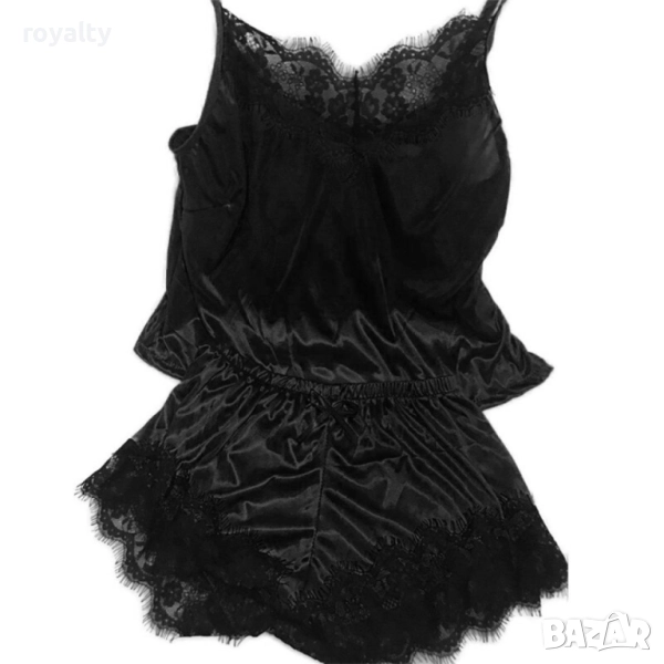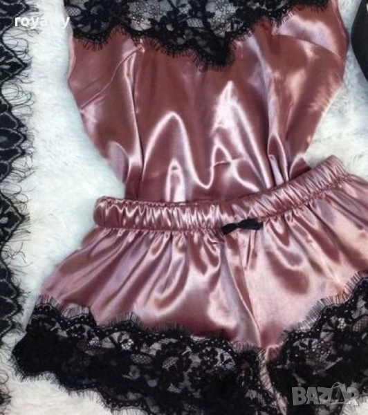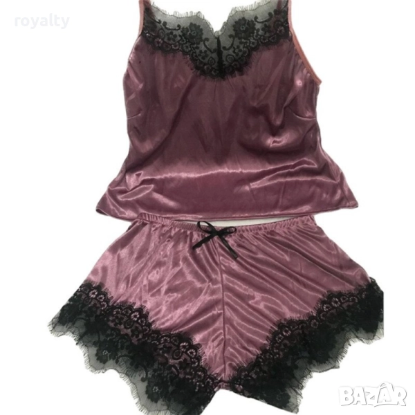 Елегантна дамска пижама – топ, къси панталонки и сатениран аксесоар