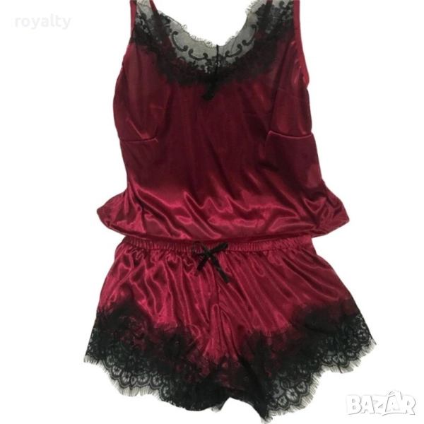 Елегантна дамска пижама – топ, къси панталонки и сатениран аксесоар. Цветове - чисто черен/черен, червено с бяло/червен, синьо с черно/синьо, праскова/розов, зелен, жълт, сив, пепел от рози/лилав, тъмно червен, бяло и черно, ярко розово/диня. (Моля, изписвайте двата цвята х/х ) Размери - S: Дължина - 56см, Бюст - 90см, Талия - 61см; M: Дължина - 57см, Бюст - 94см, Талия - 64см; L: Дължина - 58см, Бюст - 99см, Талия - 67см; XL: Дължина - 59см, Бюст - 104см, Талия - 70см; 2XL: Дължина - 60см, Бюст - 106см, Талия - 73см;. топ, къси панталонки и сатениран аксесоар / НЯМА: синьо с черно/синьо -S 2XL , праскова/розов - 2XL