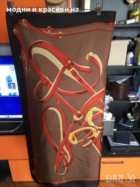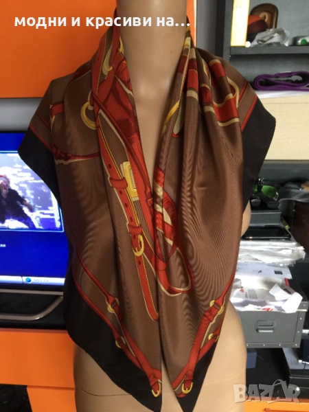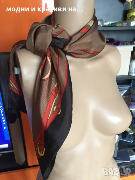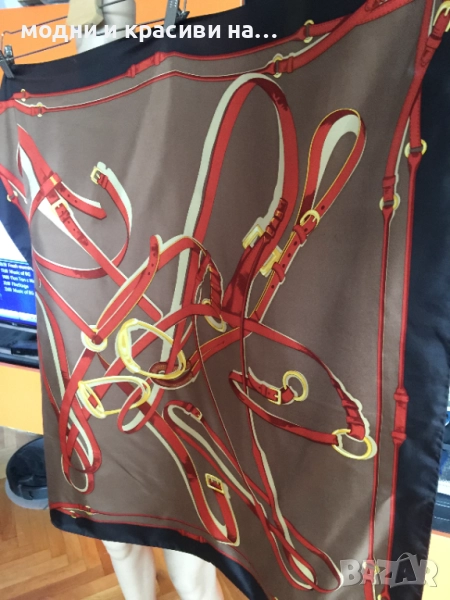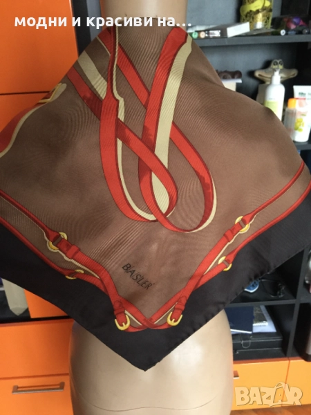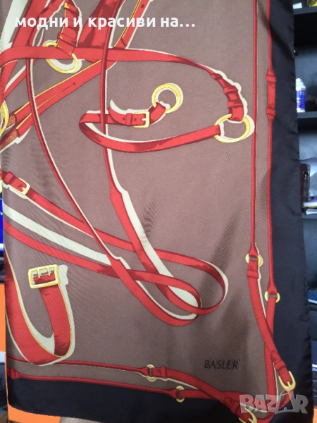 Разкошен, голям копринен шал на немския бранд Basler. Наситени цветове,качествена и изискана материя-коприна-лъскава и галеща кожата. Шалът е с основен цвят шоколадово кафяво с акценти в червено, по- малко бяло и златисто. Черното присъства по целия шал в краищата. Особено силно се откроява на дреха в червен, коралов цвят.