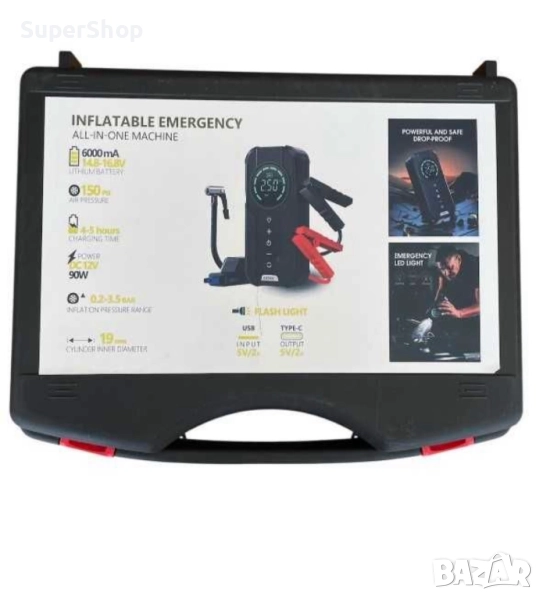Мощно SMART стартерно устройство с компресор 12V и стартов ток 1500A за до 30 стартирания, подходящо за мотори, леки коли, джипове, бусове и каравани с дизелови двигатели до 5.0L и бензинови до 7.0L. Вграденият компресор 150PSI осигурява лесно напомпване на гуми, а вграденият LED фенер позволява работа при аварийни ситуации и през нощта. Идеално за пътуване и спешни случаи.