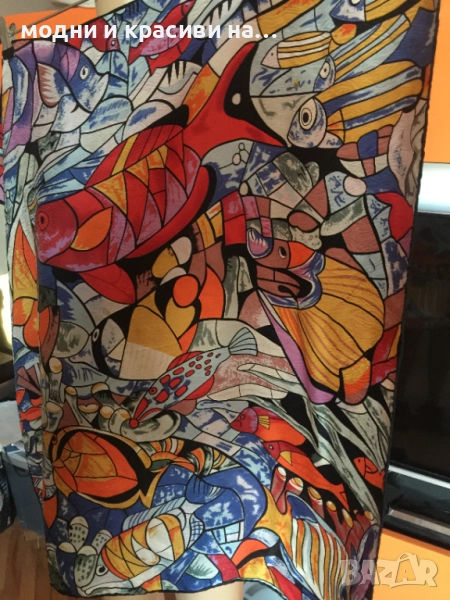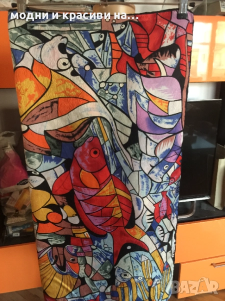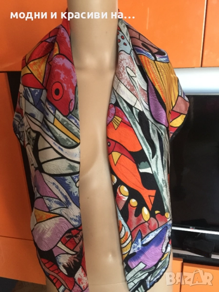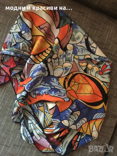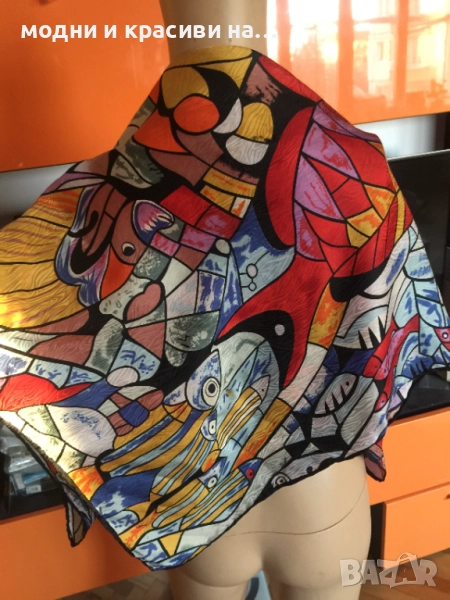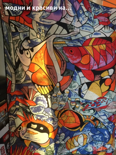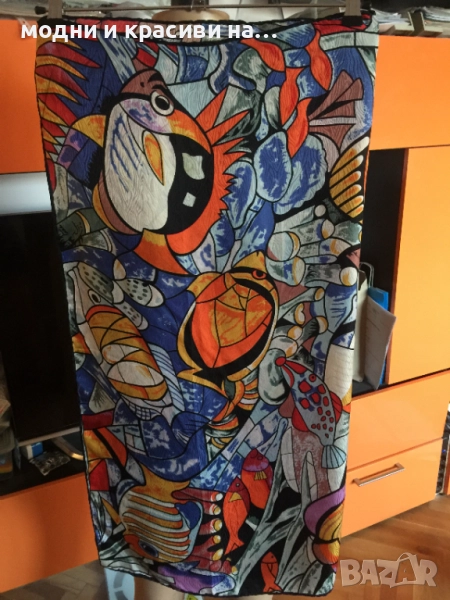 Разкошен шал, с пъстри, наситени цеетове с десен морски свят. Пъстрите, разнообразни тонове позволяват много комбинации. Шалът се откроява особено силно с дреха в оранж или синьо. Материята е плътна, тежко падаща. Съставът е коприна и вискоза (изрязала съм етикета), като самия плат е релефен и стои много красиво, с отблясъци.
