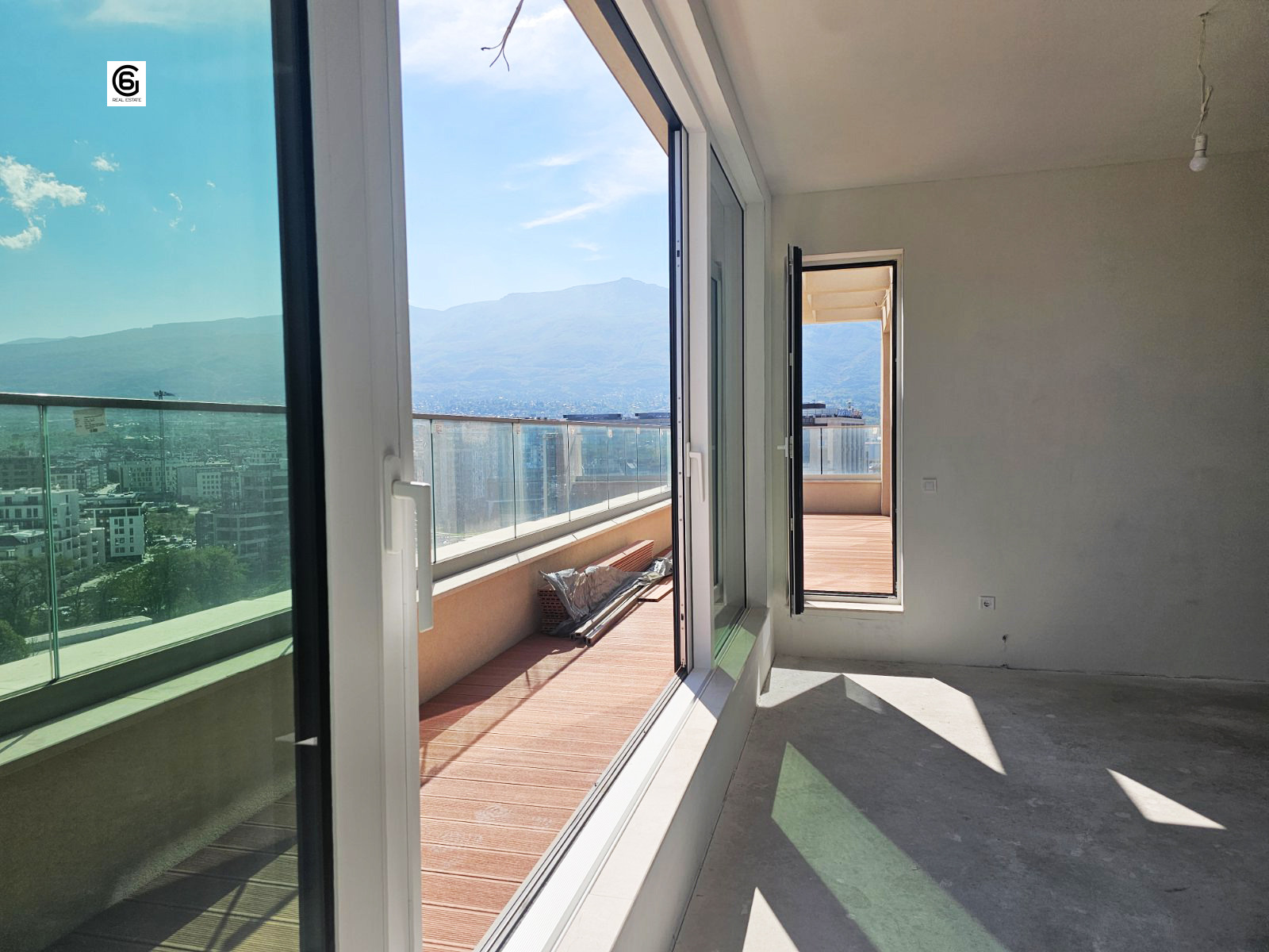 Разпределението е следното: антре/коридор, дневна с трапезария, кухня, три спални, 2 бани с тоалетна и 4 тераси с уникална гледка към планина Витоша и град София.