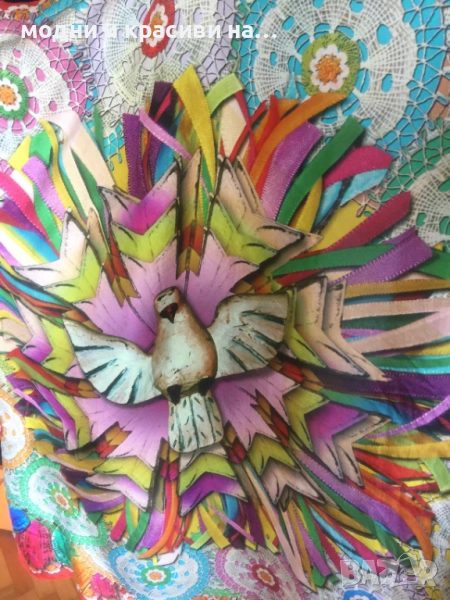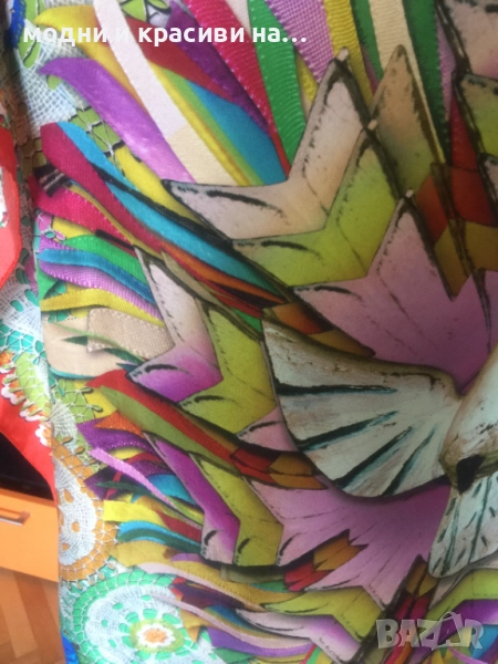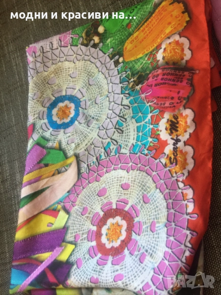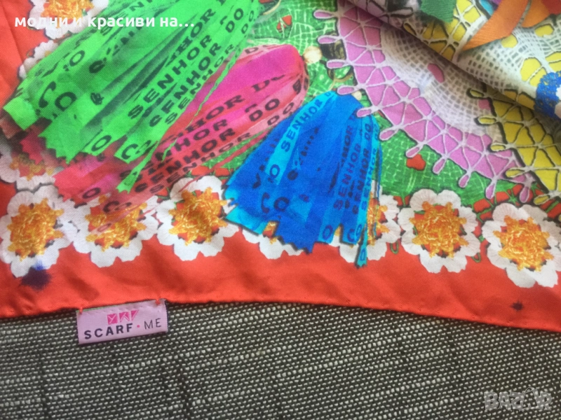 Феерия от цветове, наситени, ярки, въздействащи и цялата тази палитра възпроизведена въру този шал. Красота, изящество, неповторимост. Шалът е производство на бразилски бранд и е точно в духа на горещата, южняшка кръв и цветните, завладяващи цветове. От плътна коприна е( състава е изрязан), ръчно направен шев по краищата.Единствена забележка две петънца на последната снимка, но на фона на този цветови колорит не се забелязват.