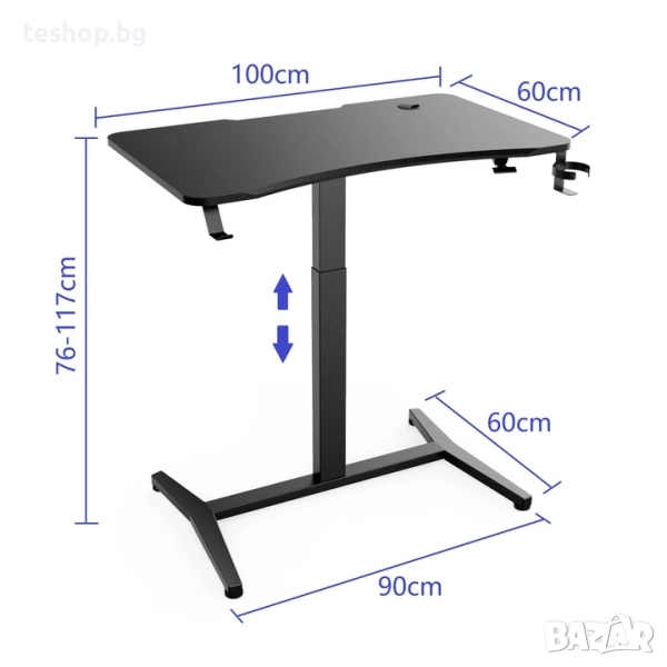 Регулирането на височината чрез газова пружина система изисква минимално усилие - плавно регулируемият пружинен механизъм позволява лесен и плавен преход от седнало към изправено положение за секунди. Бюрото може лесно да се повдигне чрез натискане на лоста от предната страна на бюрото и повдигането му до желаната височина. За да спуснете бюрото, натиснете лоста и упражнете сила надолу от 5-10 кг. Диапазонът на регулиране на височината е от 76 см до 117 см.