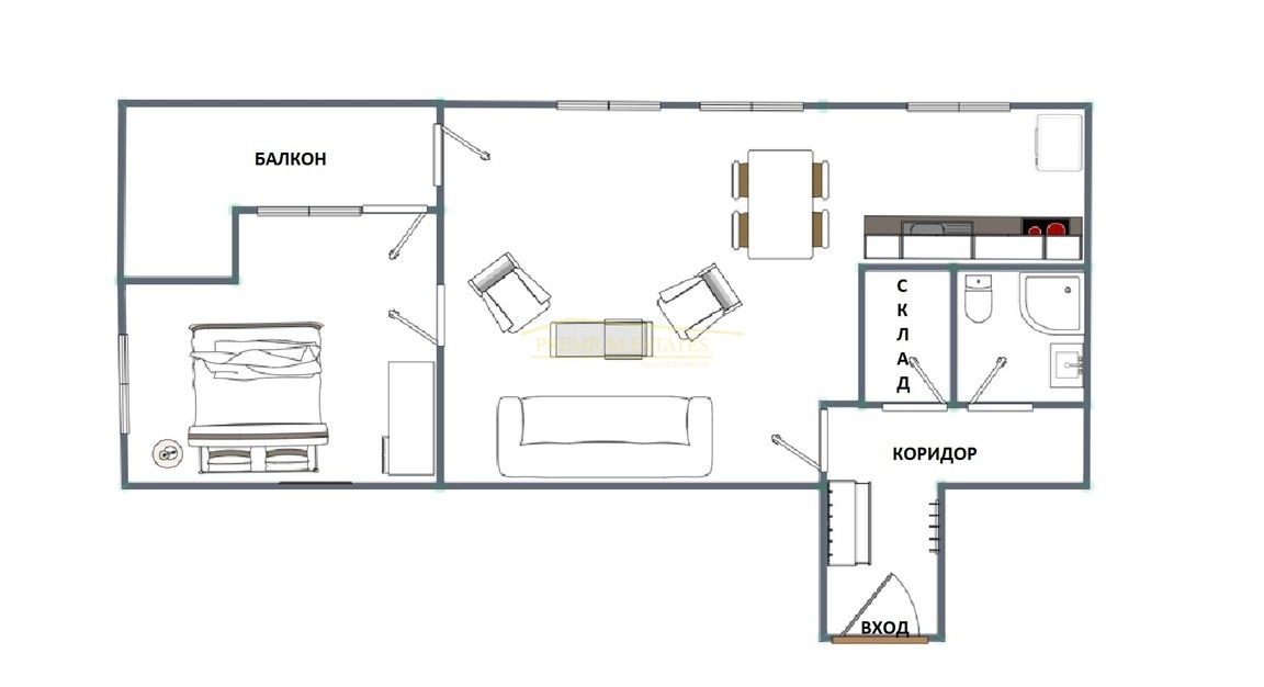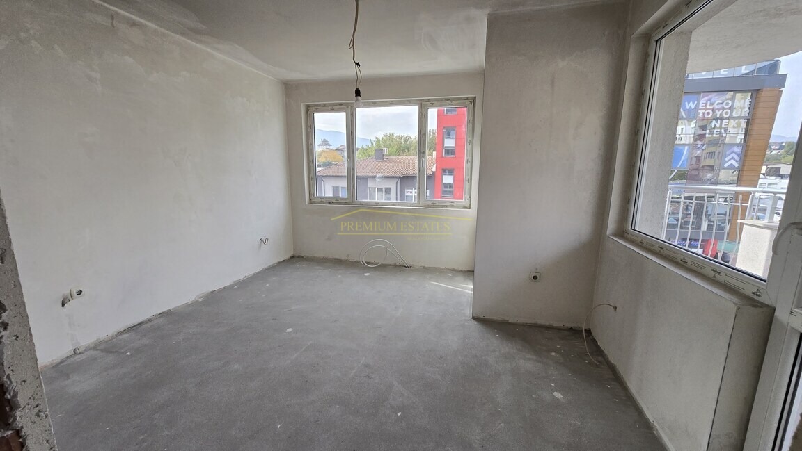 - Разпределение: антре, баня с тоалетна, просторна всекидневна с кухненски бокс (възможност за обособяване на втора стая),балкон и спалня