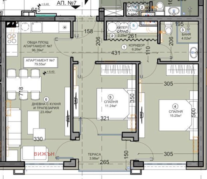 Агенция Вижън Ви предлага 3-стаен апартамент /ап.Б7 на схемата/, находящ се в сграда с модерни общи части, която разполага с денонощно видеонаблюдение и система за контрол на достъпа, осигуряващи спокойствието на всички обитатели. Строителството ще бъде изпълнено с материали от висок клас, иновативни фасадни решения изпълнени с HPL и ETALBOND, общи части изпълнени с висок клас строителни материали и хидравличен асансьор на испанската марка Орона. Има възможност за покупка на подземни паркоместа /11 000 - 12 000 евро/, надземни паркоместа /7500 евро/, надземни гаражи /25 000 евро/ и подземни гаражи /18-20 000 евро/. Сградата е проектирана да осигурява максимално количество естествена светлина за всички апартаменти. Района е добре устроен и комуникативен. Благоприятната локация там прави имота подходящ както за инвестиционна цел, така и за лично ползване. Апартаментът който предлагаме е на 3 етаж /2-ри жилищен/, с изложение: юг. РЗП на имота 96,39 кв.м от които 79,55 кв.м застроена площ и 16,84 кв.м общи части, разгърната по следния практичен начин: хол с трапезария и кухненски бокс, спалня, детска стая, тераса, баня с тоалетна, коридор и килер. Отоплението в сградата е на ТЕЦ. В близост има: хипермаркет, аптека, училища, детска градина, банки, кооперативен пазар, спирка за града и столицата. Агенцията също така съдейства и за отпускане на банков ипотечен кредит още на Акт 14, изготвяне на пазарна оценка на имота, както и за довършване и обзавеждане на дома ви. Повече информация за самият проект можете да откриете на нашият сайт - https://vision-estates.com/imoti/orhideya-park/orhideya-2-sgrada-3/