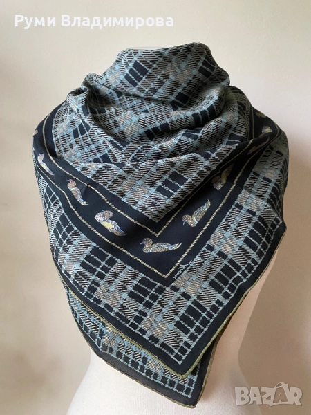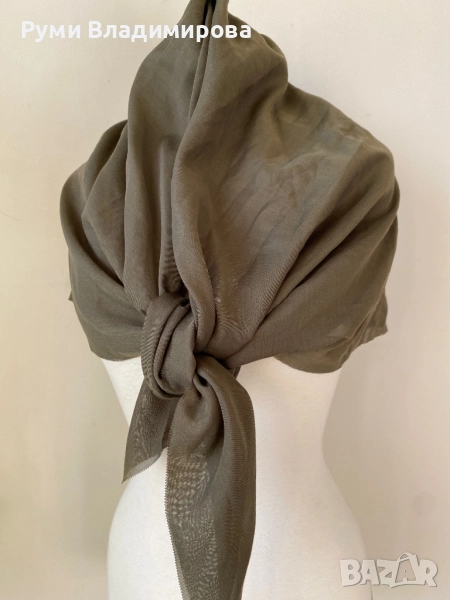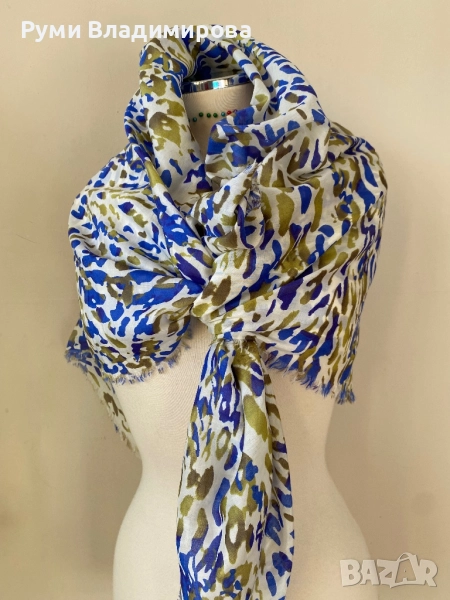 Копринен/ памучен шал Раssigatti в леопардов принт в тъмно синьо и тютюнево зелено, тънка и фина материя от 70 % фин памук и 30 % коприна, размер 106 Х 107 см, нов, много нежен, италиански шал. Доставка с Еконт. Цена на този 20 кв.