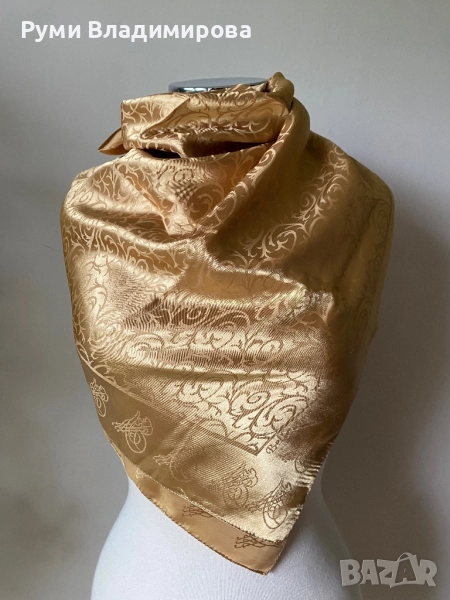 Квадратен шал в златист цвят/ Кърпа за глава, лъскав, златист шал, размери 90 Х 90 см, десен на флорални мотиви, без етикети, според мен полиестер, много подходящ за златен акцент, на самия шал в единия край е изписано bellasima, нов, доставка с Еконт.