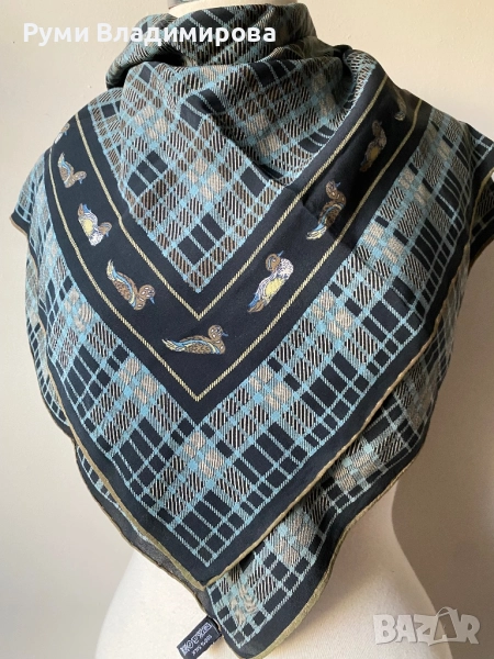 Черна копринена кърпа за глава/ кариран шал, тюркоазен и тютюнев цвят в карето, украса с патета, плътна коприна, стилен шал, размер 80 Х 81 см, състояние отлично. Доставка с Еконт!
