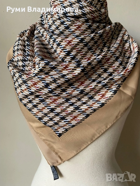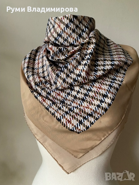 Копринена, бежова кърпа за глава/ копринен, бежов шал, размер - голям квадрат 82 Х 85 см, 100 % коприна, графичен мотив, винтидж стил. Доставка с Еконт!.