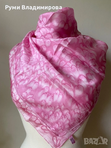 Розова, копринена кърпа за глава/ шал, рисувана коприна, тънка като хартия, размери 90 Х 86 см, цвят бебешко розово и бяло, като нов, доставка с Еконт.