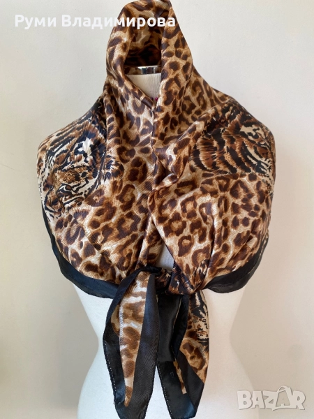 Кърпа за глава в синьо и оранжево, с тигрови мотиви, тънка като хартия коприна, има етикет за състав, квадратен шал, размер 87 Х 87 см, като нов. Доставка с Еконт.