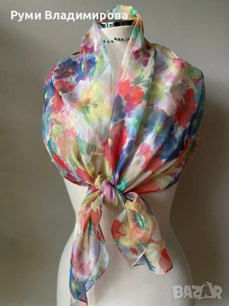 Шал на цветя за цветен акцент, тънък и прозрачен, голям квадрат 102 Х 105 см, липсват етикети, но според мен е полиестер, състояние нов. Доставка с Еконт.