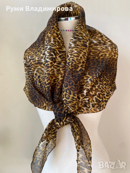 Леопардов шал, голям квадрат 100 Х 106 см, вафлена материя, липсват етикети за състав, прозрачност, подходящ като парео през лятото, като нов. Доставка с Еконт. Цена на този 20 лв.