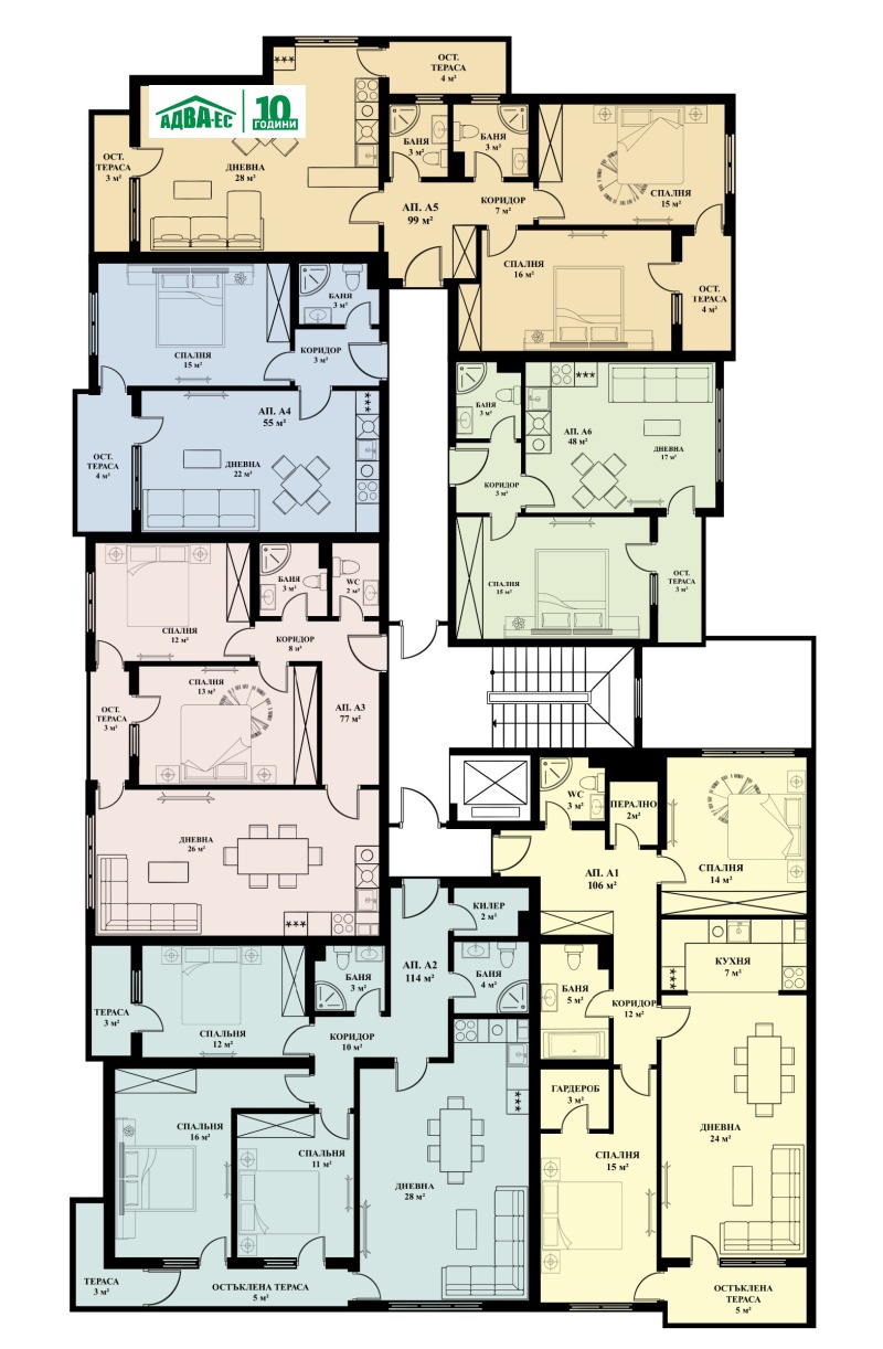 Апартаментите се предлагат по БДС шпакловани стени и подове със замазка.