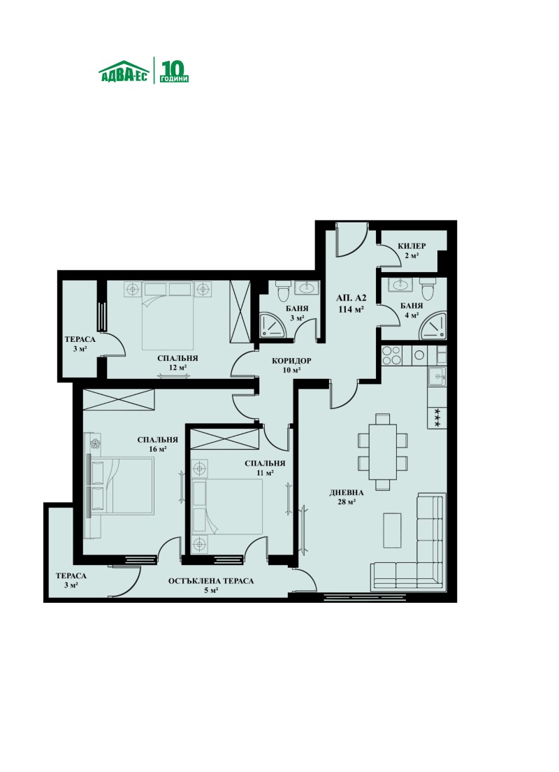 антре, дневна с кухненски бокс (28 м²) с излаз към две тераси (8 и 3 м²),