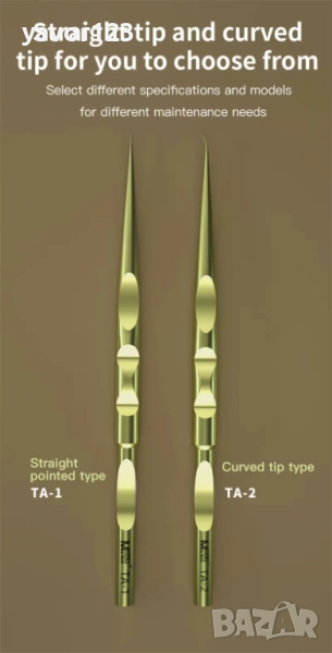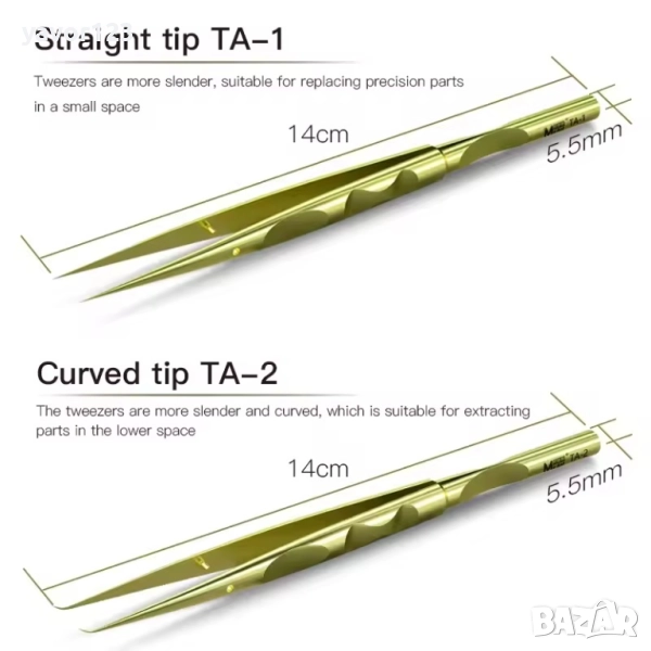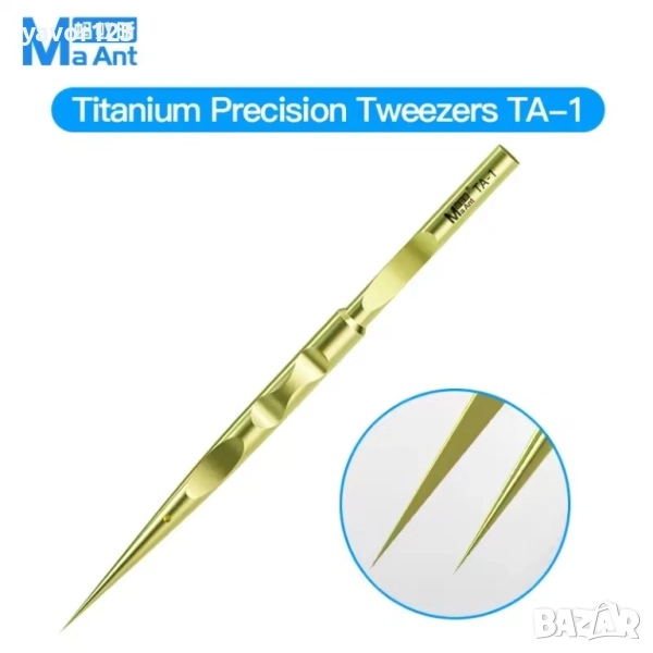 Прецизните пинсети MaAnt TA-1 и TA-2 са висококачествени инструменти, изработени от титанова сплав, предназначени за изключително фини задачи в ремонта на електроника, като например работа с дънни платки на мобилни телефони и запояване на тънки проводници.