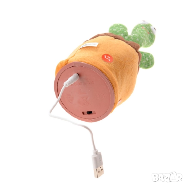 Кактусът има вградени песнички на английски и се зарежда чрез USB кабел (включен в комплекта).