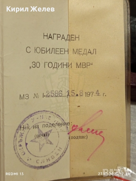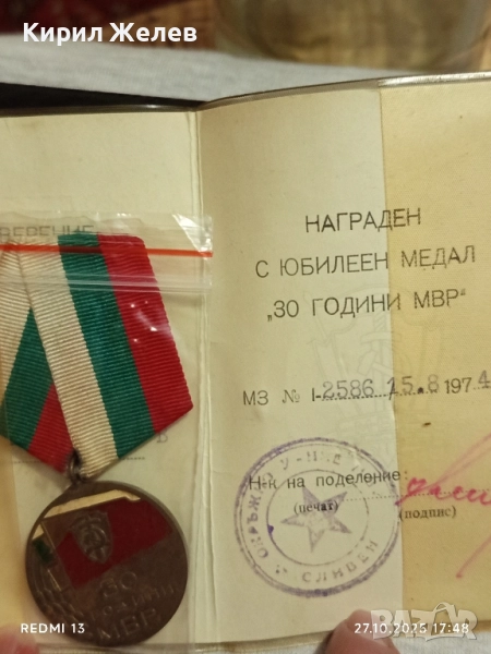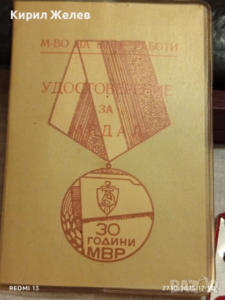Медал 30г. МВР рядък с удостоверение за КОЛЕКЦИОНЕРИ 34335