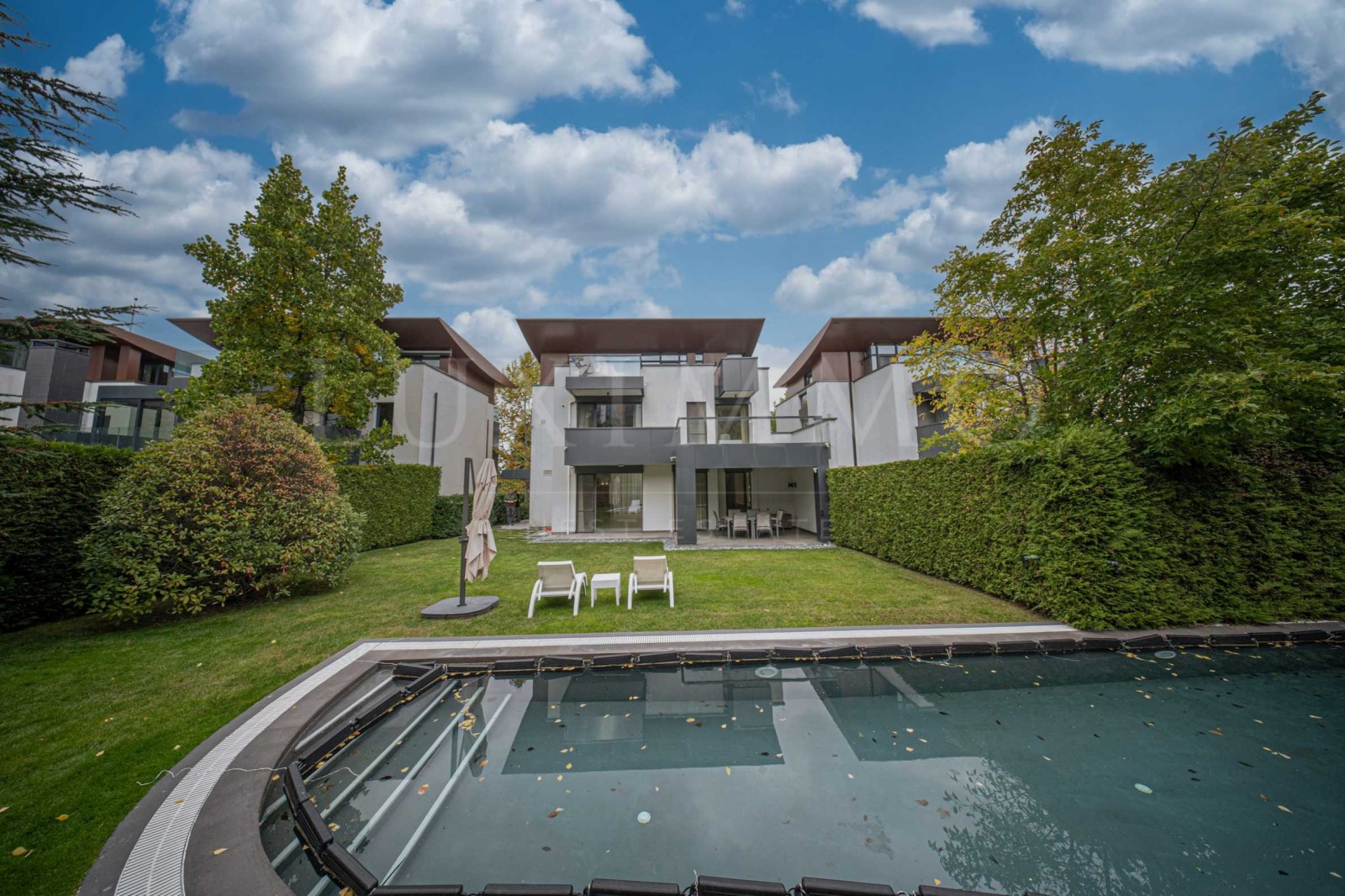 голям, озеленен двор с басейн;