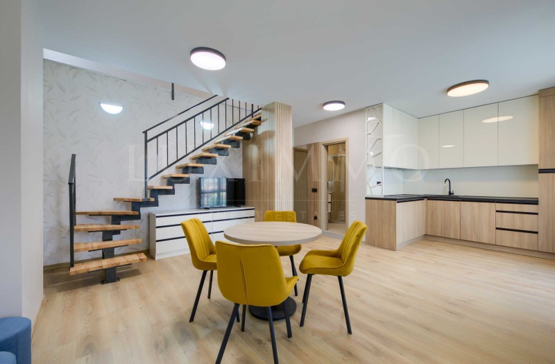 Имотът е разположен на 5-и последен етаж с изложение изток и предлага 100,12 кв.м обща площ. Състои се от всекидневна с излаз на тераса и тоалетна на първо ниво, спалня с излаз на тераса и баня с тоалетна на второ ниво.