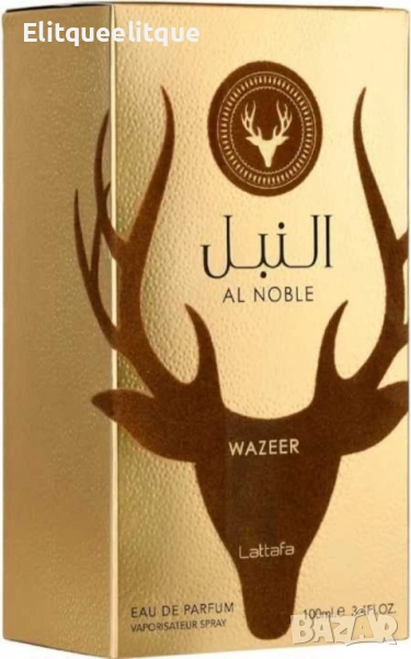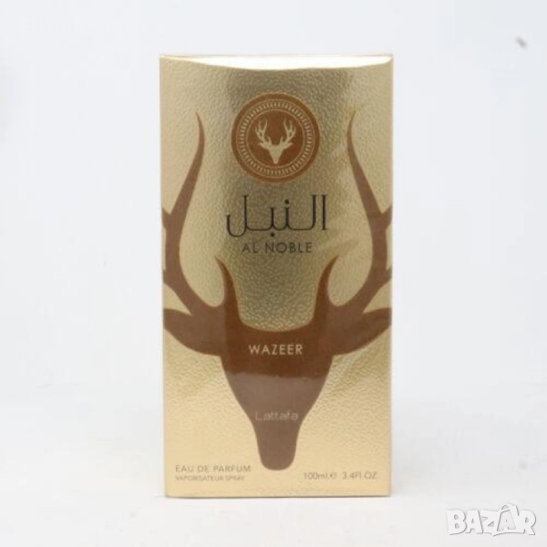 Неустоим парфюм Wazeer Al Noble от Lattafa,100мл Тип: Парфюмна вода Количество - 100мл. Състав: - Връхни нотки - мента, портокал, хвойна и бергамот - Средни нотки - шоколад, карамел, круша, ирис и малина - Базови нотки - сандалово дърво, кехлибар, ванилия, кедър, мускус и ветивер Парфюм Wazeer Al Noble от Lattafa Perfumes е плодово-дървесен, прахообразен аромат за жени и мъже.