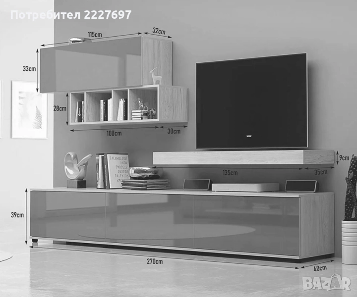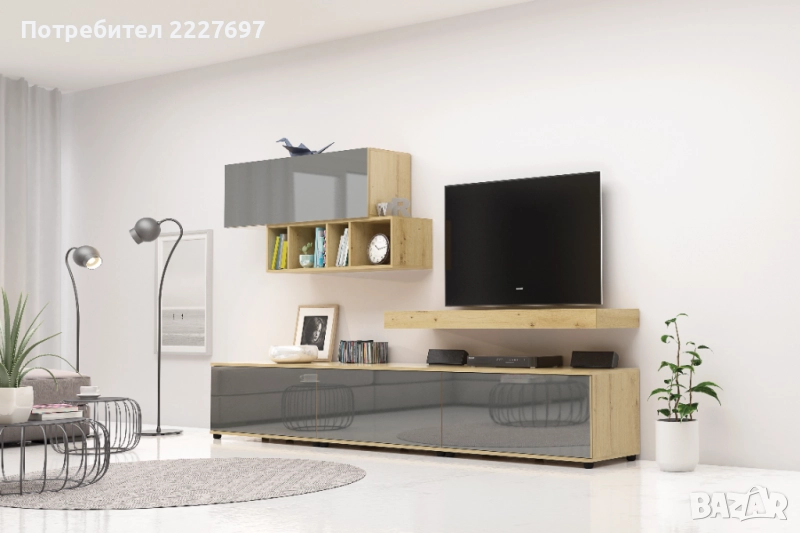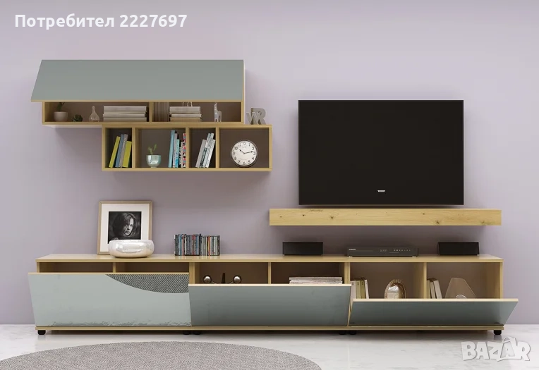 Секцията разполага със стенна етажерка с повдигаща врата и отворени рафтове и долен шкаф с три клапващи врати.