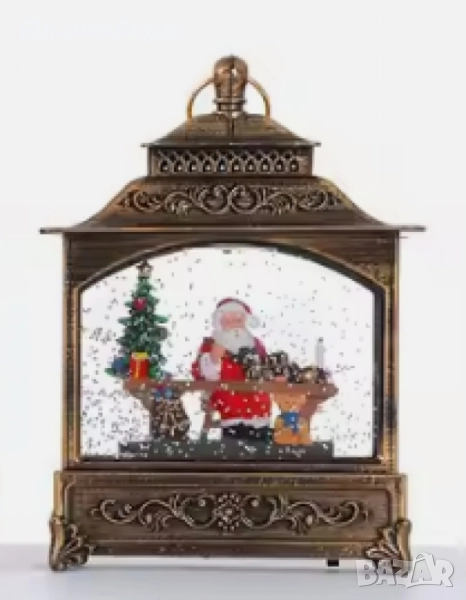 Материал: Пластмаса и стъкло; Захранване: Батерии; Осветление: LED светлина; Цвят: Бронзов завършек с цветни фигури; Вариант 1: Дядо Коледа с подаръци; Вариант 2: Дядо Коледа с елените; Вариант 3: Снежен човек; Вариант 4: Дядо Коледа отпътувайки с елените.