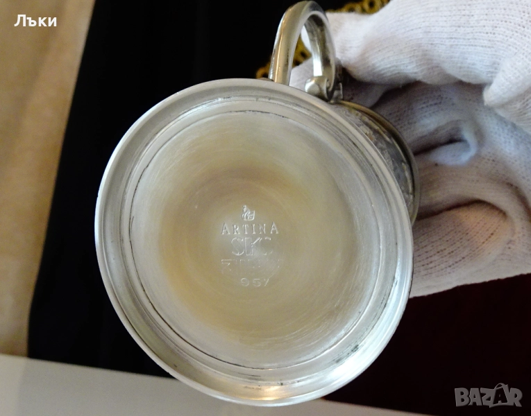 калай и 5% сребро,маркирана с инициалите на световно известната фабрика Artina SkS.Декорирана с три