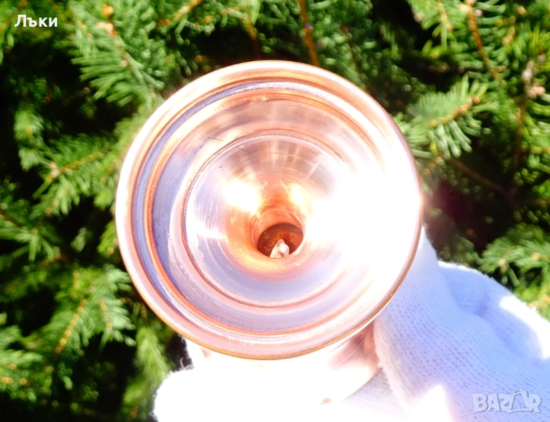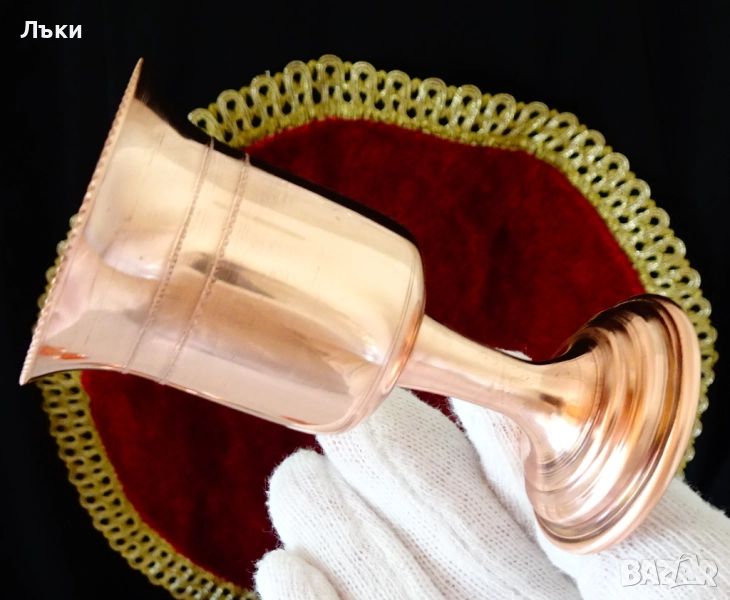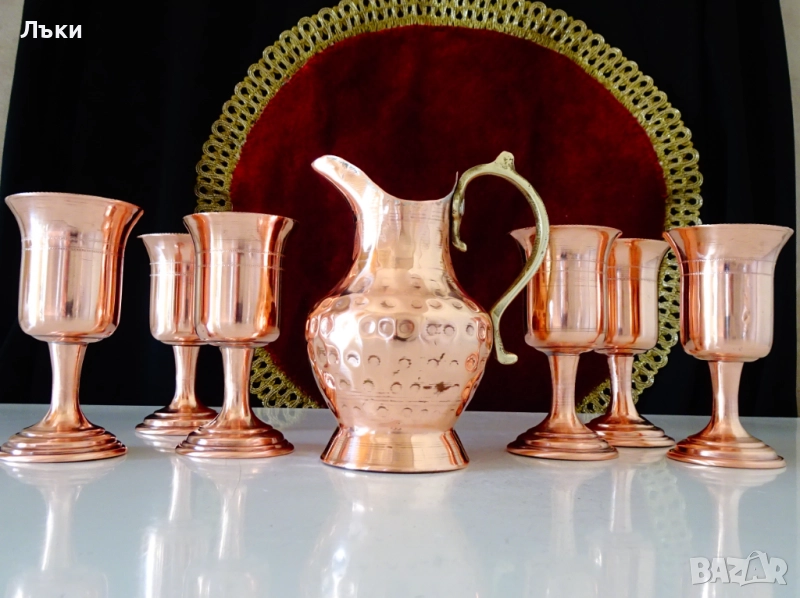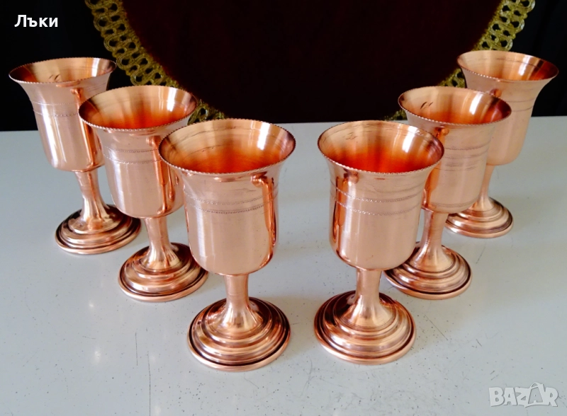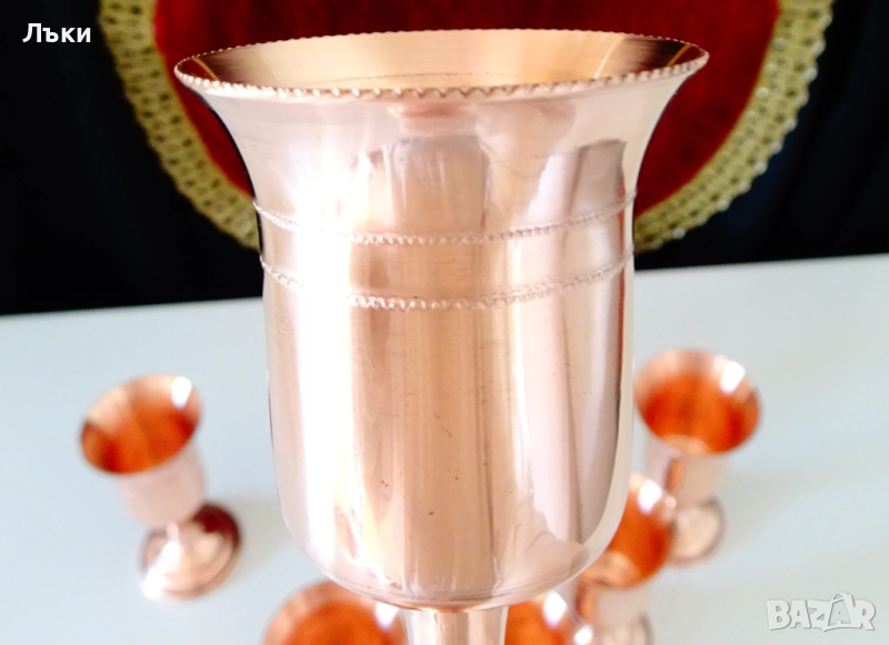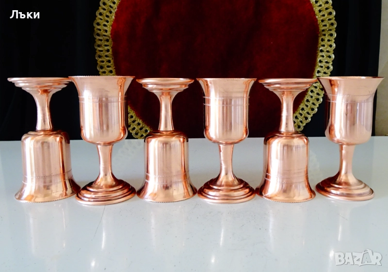 Старинни медни чаши за ракия,повдигнати на столче,майсторска