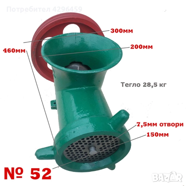 Професионална чугунена месомелачка №52 е изключително здрав уред, създаден за тежка и продължителна работа. Тази месомелачка е предназначена за задвижване с външен мотор и е подходяща за смилане на всякакъв вид месо – свинско, говеждо, телешко, дивечово или пилешко. Благодарение на масивното си тяло и устойчивата изработка, моделът осигурява дълъг живот и висока производителност при минимално износване.
