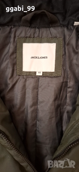 Зимно мъжко яке Jack&Jones, по етикет XS. Леко, удобно,качествена изработка. Има 5 джоба, плетен маншет, на качулката има ластик за пристягане, пухчето може да се сваля. Цвят-тъмнозелен. Носено, но без конкретни забележки.