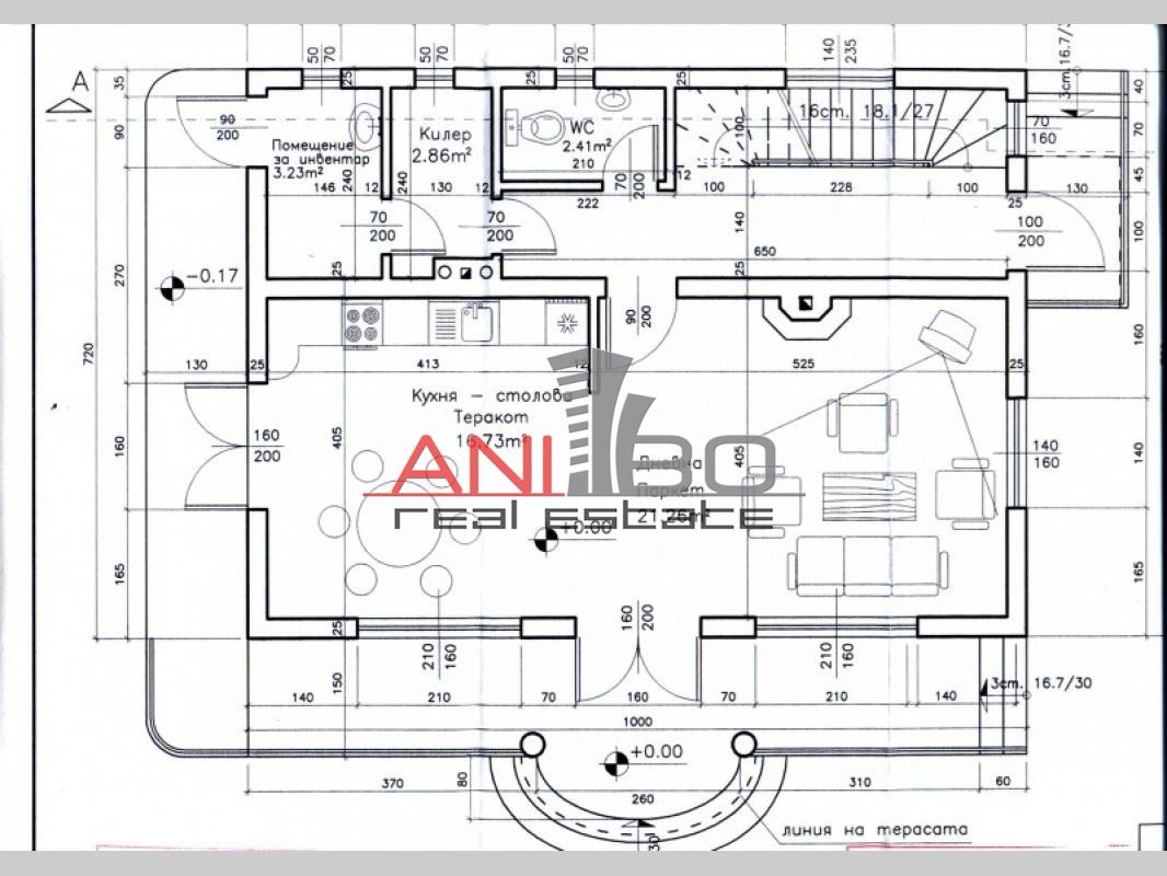 Първи етаж: ГОЛЯМА дневна с обособена кухненска зона, перално помещение, санитарен възел и веранда.